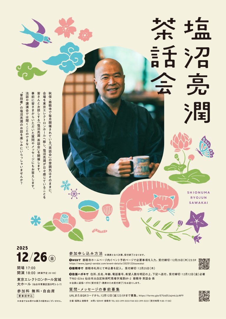 仙台市秋保にある慈眼寺の住職である塩沼亮潤さんが、日々感じていることを来場者とお話しする「茶話会」。法話や講演会では聞くことのできない“普段着”のお話を楽しめる会として、慈眼寺の四季を切り取ったイラストを散りばめ、親しみやすくあたたかな「茶話会」の雰囲気を表現しました。