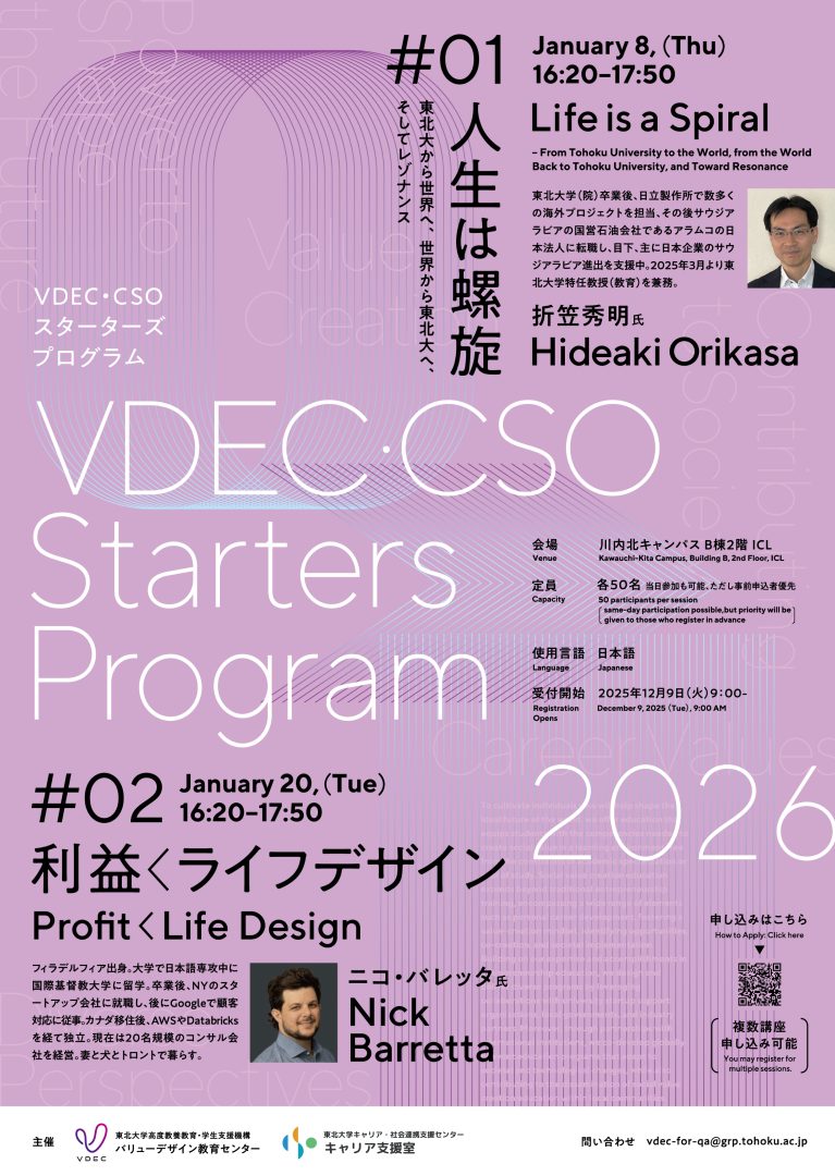 東北大学バリューデザイン教育センター主催のプログラム告知フライヤー。